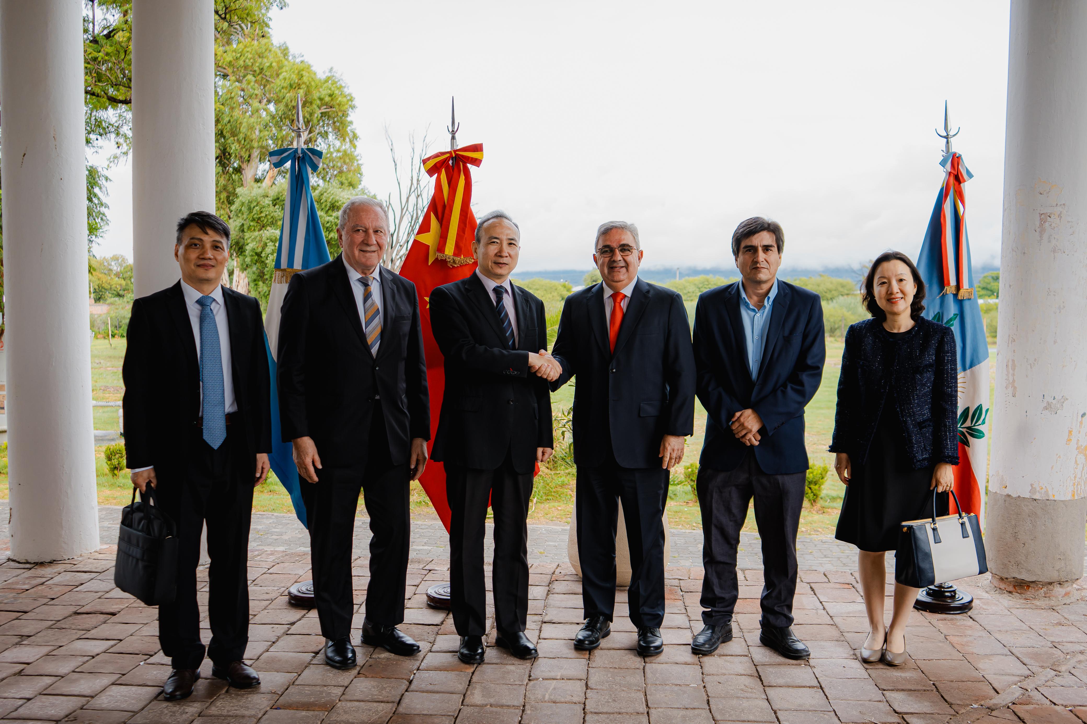 El mandatario provincial estuvo acompañado por el vicegobernador Rubén Dusso y el ministro de Minería, Marcelo Murua. Por parte de la comitiva china participaron Xue Dongxiao; el consejero económico y comercial, An Guanghui; el secretario del embajador, Xie Zhicheng; la secretaria del consejero, Mei Yuzhe; y la funcionaria Lou Anran.