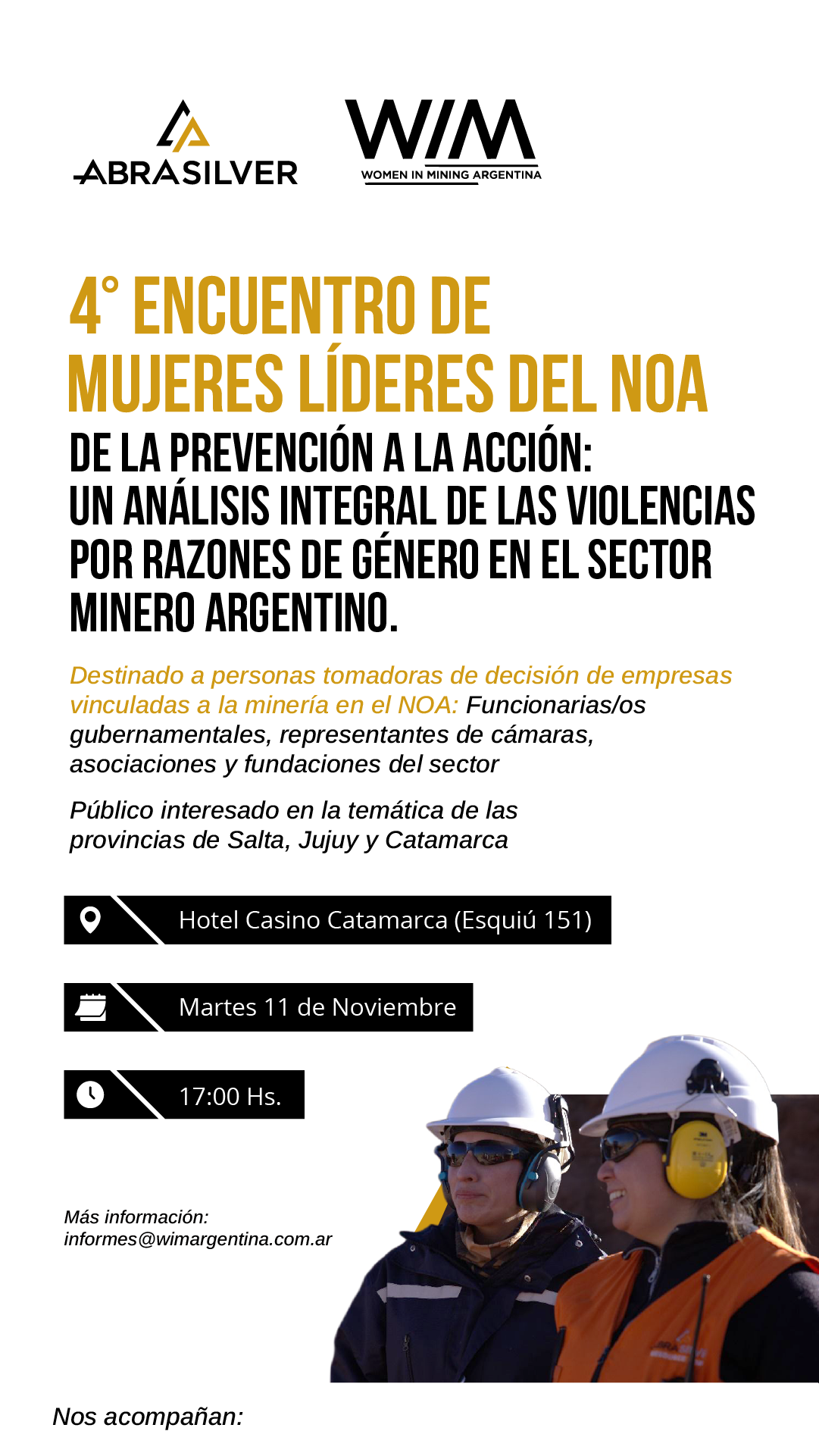 El próximo martes 11 de noviembre a las 17:00 h, en el Hotel Casino Catamarca (Esquiú 151), AbraSilver Resource Corp. y Women in Mining Argentina (WIM Argentina) llevarán adelante el 4° Encuentro de Mujeres Líderes del NOA, bajo el lema “De la Prevención a la Acción: Un análisis integral de las violencias por razones de género en el sector minero argentino.”