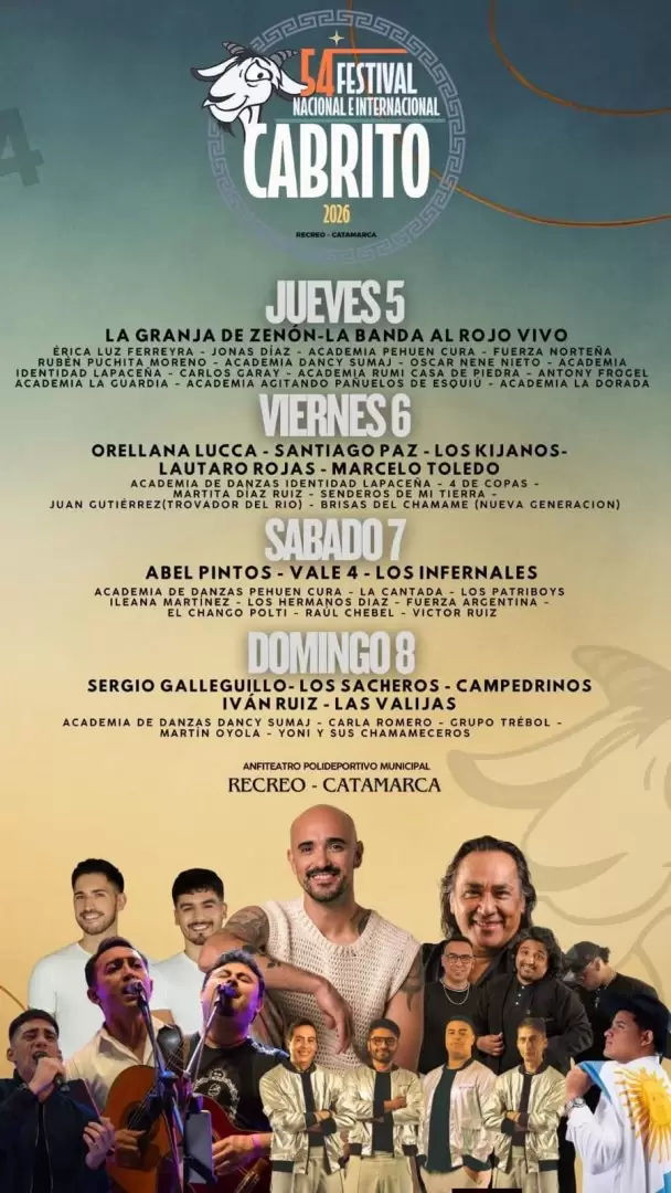 El Polideportivo Municipal de Recreo será la sede de la 54° edición del Festival Nacional e Internacional del Cabrito, una cita que promete honrar la identidad de la región a través de la música, la danza y la degustación del que es considerado el mejor cabrito del país. Bajo el hashtag #Cabrito2026, la agenda oficial ya está confirmada para los días 5, 6, 7 y 8 de febrero, ofreciendo un despliegue artístico de primer nivel.